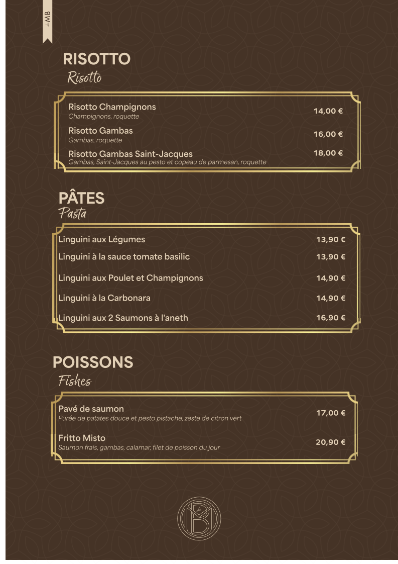 - Risotto: Enjoy rich and creamy options such as Risotto Champignons (€14) or the luxurious Risotto Gambas St Jacques (€18).